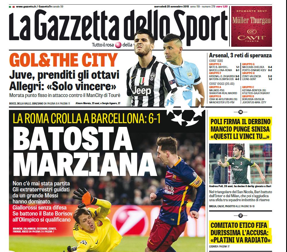 CalcioNewsRassegna Stampa [Foto] Gazzetta dello Sport – Batosta marziana, la Roma crolla a Barcellona By Giuseppe Sacco il Nov 25, 2015 - 08:40:09 0 Condividi Factory della Comunicazione BarcellonaCalcioRoma 0 Condividi FacebookTwitterGoogle+ReddItWhatsAppPinterestE-mail