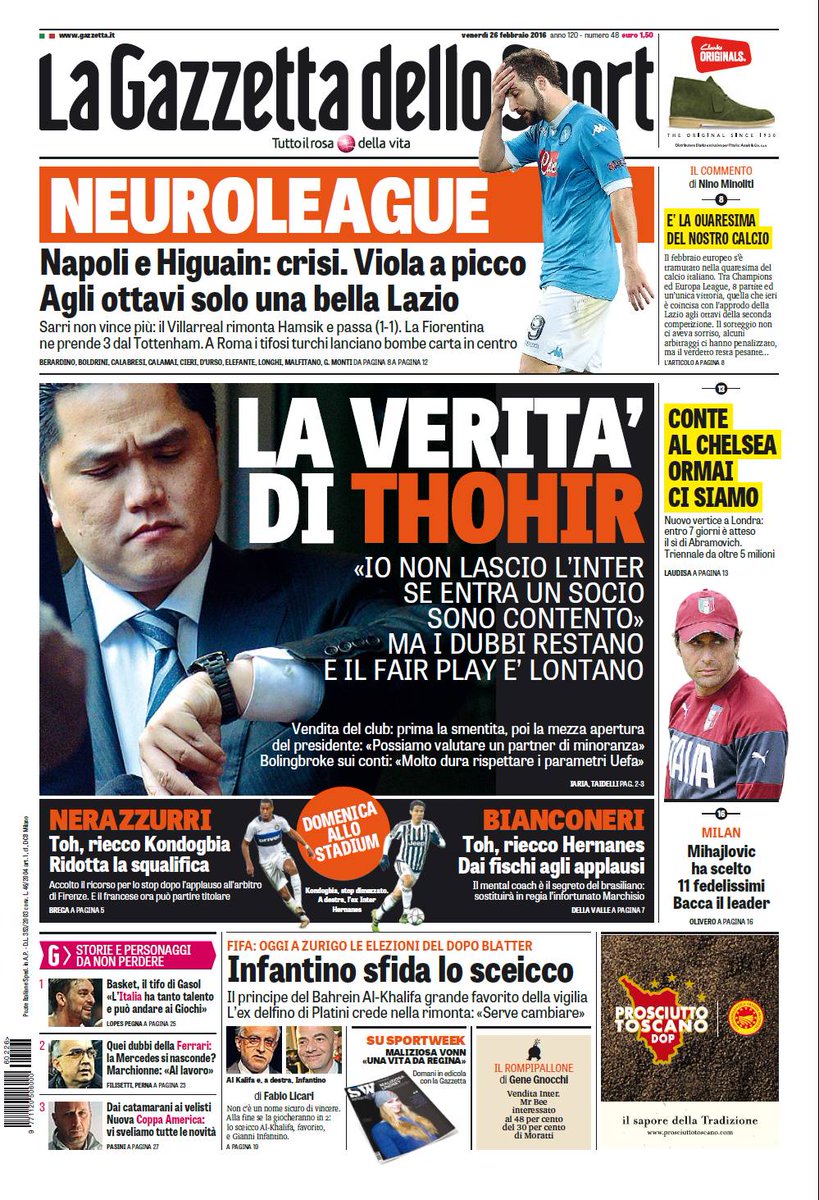 CalcioIn EvidenzaNews Rassegna stampa – Prime pagine sportive del 26 febbraio By Alessandro Sacco il Feb 26, 2016 - 08:00:35 0 Condividi Factory della Comunicazione PagineprimeRassegnaSport 0 Condividi FacebookTwitterGoogle+ReddItWhatsAppPinterestE-mail