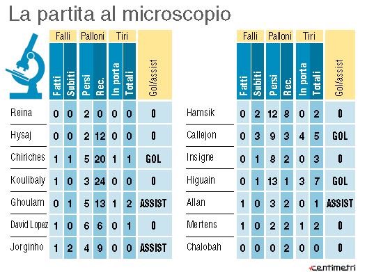 Napoli (4-3-3): Reina; Hysaj,Albiol, Koulibaly,Ghoulam;Allan,Jorginho,Hamsik;Callejon (13’ st Mertens),Higuain(43’ st El Kaddouri),Insigne (26’ st Gabbiadini). Inpanchina:Rafael, Gabriel,Strinic, Valdifiori, Maggio,Regini,DavidLopez,Chiriches,Chalobah.All.: Sarri.