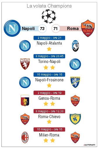 In questa volata finale ogni piccolo particolare potrà fare la differenza. Punti di forza e punti di debolezza di Napoli e Roma: la lunga guerra anche di nervi è già partita. Il Napoli dovràr icaricarsi in fretta tenendo presente innanzitutto questi due aspetti: due punti in più in classifica (potenzialmente uno però, perché l’arrivo a pari punti manderebbe la Roma in Champions) e la possibilità di giocare due volte al San Paolo, finora vera e propria roccaforte, contro l’Atalanta e il Frosinone. Gli azzurri in casa riescono a produrre il loro gioco con maggiori convinzioni e possono contare sull’effetto incitamento del pubblico che fa la differenza. La Roma invece deve ancora recuperare e giocherà due volte fuori:lunedì al Ferraris contro il Genoa e nell’ultimo turno al Meazza con il Milan e unain casa con il Chievo. Fonte: Il Mattino