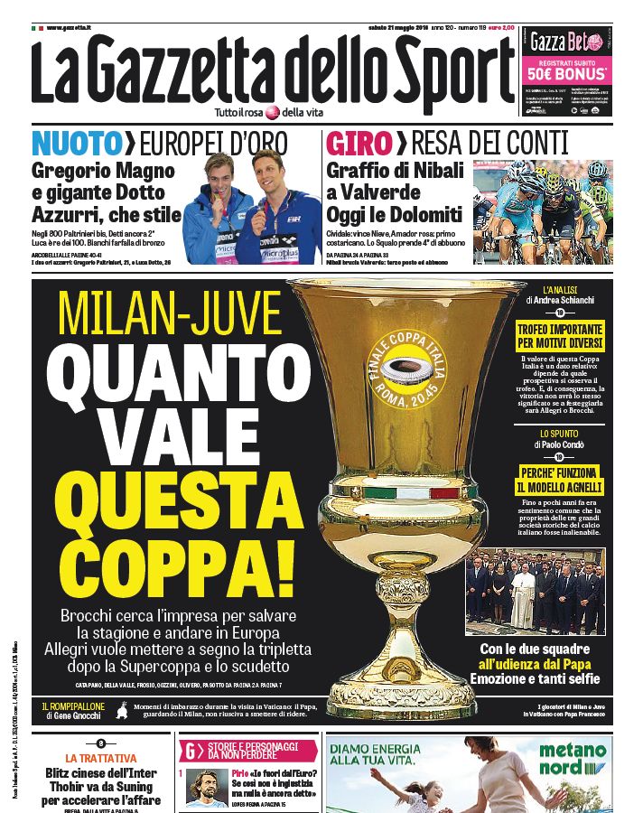 CalcioIn EvidenzaNews Rassegna stampa del 21 maggio By Giuseppe Sacco il Mag 21, 2016 - 07:50:11 0 Condividi Factory della Comunicazione EdicolaPagineprimeRassegna 0 Condividi FacebookTwitterGoogle+ReddItWhatsAppPinterestE-mail