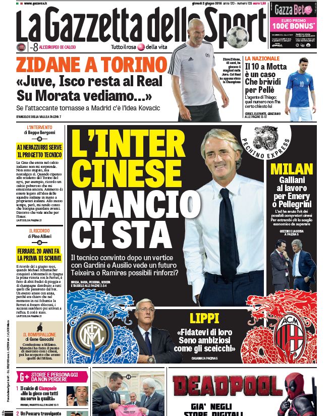 CalcioIn EvidenzaNews Edicola sportiva del 2 giugno, le prime pagine By Giuseppe Sacco il Giu 2, 2016 - 08:20:23 0 Condividi Factory della Comunicazione Juve in finale anche con i baby Napoli/Herrera la distanza è minima Le mosse di Roma e Lazio CalcioEdicolaPagineprime 0 Condividi FacebookTwitterGoogle+ReddItWhatsAppPinterestE-mail