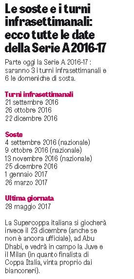 Oggi comincia ufficialmente il campionato di calcio di Serie A, stagione 2016/17. Primi due anticipi oggi e il resto domani. Di seguito le soste e i turni infrasettimanali che riguardano le partite del suddetto massimo campionato.
