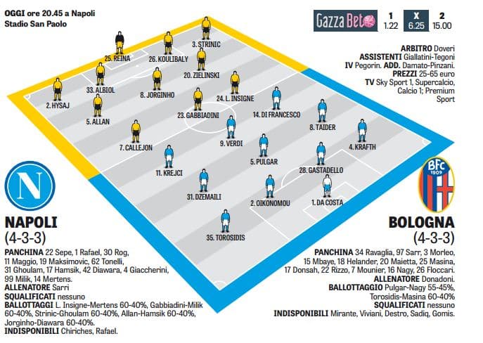 In Napoli si ritroverà l’ ex Dzemaili. I cambi azzurri? Insigne per Mertens, Gabbiadini al posto di Milik e al centrocampo Zielinski per Hamsik. In difesa rifiata Ghoulam al suo posto Strinic.