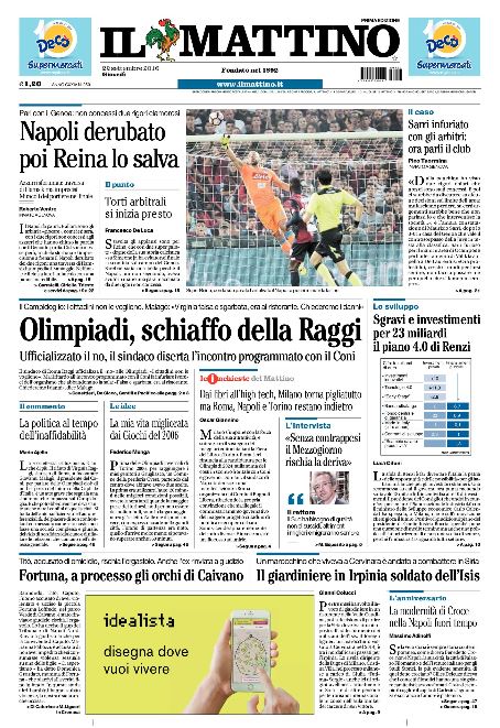 Oggi la prima pagina de Il Mattino apre con il titolo “NAPOLI derubato REINA lo salva”.
