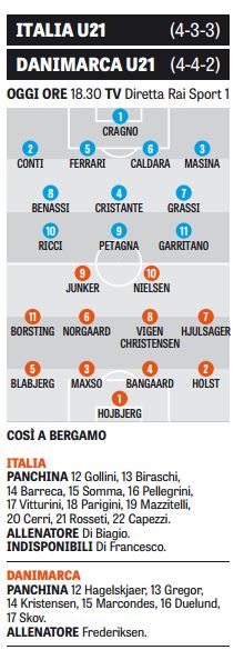 Italia­/Danimarca è un déjà vu. Due anni fa si giocò in amichevole a Matera: 1­0 per i danesi, partita non troppo divertente. Di Biagio preparava un Europeo come oggi. Differenze: la Danimarca oggi è meno forte e l’Italia ha già cominciato a lavorare sul 4­3­3. Di Biagio ha confermato che insisterà sul suo sistema di gioco preferito, che nello scorso biennio si vide solo in coda: «È il migliore per centrocampisti ed esterni». Molte meno indicazioni di formazione, così i dubbi si moltiplicano. In attacco Di Francesco è infortunato, possono giocare sia Garritano sia Parigini. In mezzo, con Cataldi da Ventura, serve un centrale: Cristante e Mazzitelli hanno chance. In difesa sperano Ferrari (dentro per Biraschi?) e Masina (per Barreca?). In ogni caso conta poco, Di Biagio farà giocare quasi tutti e probabilmente partirà con 4 atalantini: Conti, Caldara, Grassi e Petagna. Bergamo apprezzerà: allo stadio potrebbero arrivare in 10mila, non pochi per l’Under e per un’amichevole di lunedì pomeriggio. Di Biagio si è portato avanti con i complimenti: «Faccio un applauso all’Atalanta per quello che sta facendo coi giovani e uno a Gasperini, che ha avuto il coraggio di mandarli in campo».