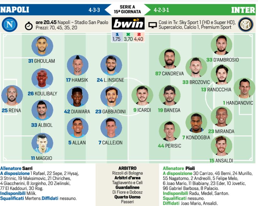 Questa sera allo stadio San Paolo l’anticipo della quindicesima giornata Napoli-Inter e chi vince può rilanciarsi in campionato. In casa azzurra in dubbio la presenza di Hysaj, al suo posto pronto Christian Maggio. Al centro torna Albiol assieme a Koulibaly. A centrocampo Diawara, Allan e Hamsik, mentre chance in attacco per Gabbiadini. I nerazzurri invece puntano sul “napoletano” D’Ambrosio, al centro Ranocchia, mentre alle spalle di Icardi favorito l’ex Siviglia Banega, con Joao Mario in panchina.