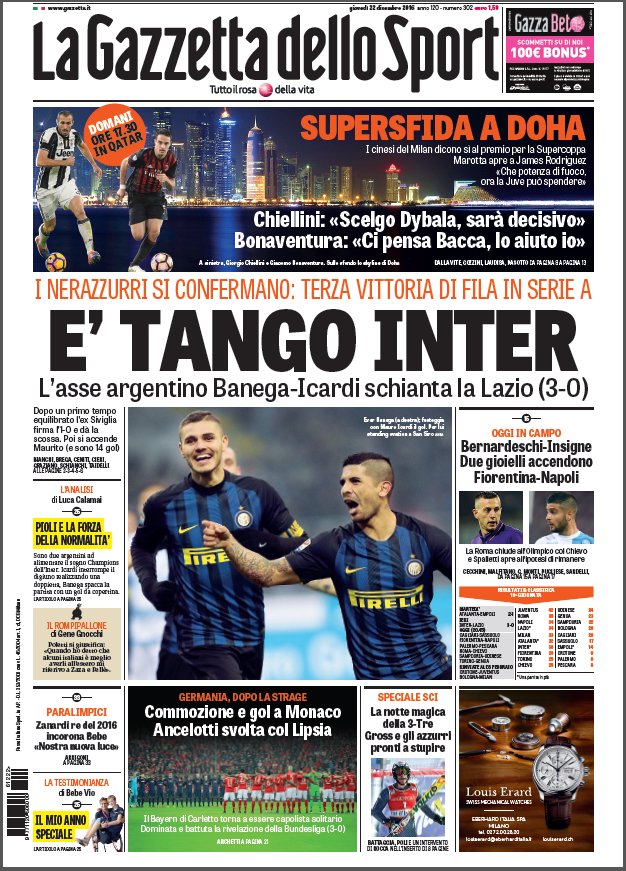 CalcioIn EvidenzaNews EDICOLA del 22 dicembre – Prime pagine sportive nazionali By Giuseppe Sacco il Dic 22, 2016 - 07:40:00 0 Condividi Factory della Comunicazione EdicolanazionaliPagineprime 0 Condividi FacebookTwitterGoogle+ReddItWhatsAppPinterestE-mail