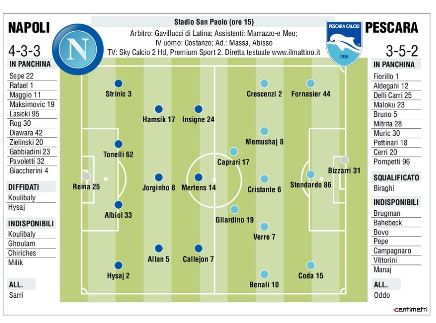 Oggi pomeriggio al San Paolo il Napoli affronterà il Pescara nel più classico dei testa-coda del campionato. Maurizio Sarri metterà al fianco di Albiol Lorenzo Tonelli. A centrocampo invece favoriti Allan e Jorginho al posto di Zielisnki e Diawara, mentre l’attacco è quello leggero per sorprendere la difesa ospite. Il tecnico degli ospiti Massimo Oddo schiererà il 3-5-2, Fornasier favorito rispetto a Bruno, centrocampo folto per impedire che la squadra azzurra possa essere incisivo nella manovra. In attacco debutto di Alberto Gilardino.