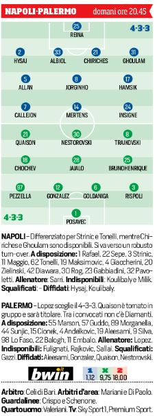 CalcioNewsRassegna Stampa Napoli/Palermo, le formazioni del Corriere dello Sport, i tre piccoletti ed un ritorno in difesa By Giuseppe Sacco il Gen 28, 2017 - 21:45:47 0 Condividi Chiriches preferito a Mak, e ritoprno di Ghoulam in difesa. Jorginho per Diawara Factory della Comunicazione FormazioniNapoliPalermo 0 Condividi FacebookTwitterGoogle+ReddItWhatsAppPinterestE-mail