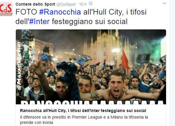 CalcioNewsRassegna Stampa Inaspettata reazione dei tifosi dell’Inter alla cessione di Ranocchia By Giuseppe Sacco il Feb 1, 2017 - 10:15:53 0 Condividi Ecco quanto pubblica su twitter il Corriere dello Sport Factory della Comunicazione InterRanocchiatifosi 0 Condividi FacebookTwitterGoogle+ReddItWhatsAppPinterestE-mail