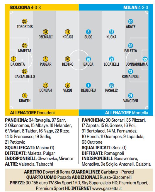 CalcioNews Ore 20:45 – Bologna/Milan le possibili formazioni della Gazzetta By Giuseppe Sacco il Feb 8, 2017 - 18:15:14 0 Condividi Così in campo secondo la Rosa Factory della Comunicazione BolognaFormazioniGazxzettaMilan 0 Condividi FacebookTwitterGoogle+ReddItWhatsAppPinterestE-mail