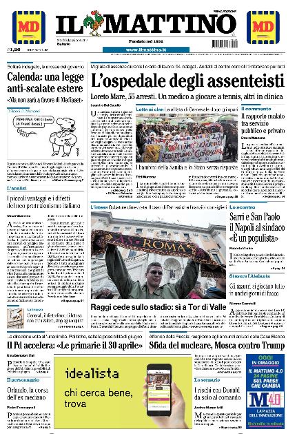 CalcioIn EvidenzaNews EDICOLA Sportiva – Le prime pagine nazionali del 25 febbraio By Giuseppe Sacco il Feb 25, 2017 - 07:35:34 0 Condividi Oggi in primo piano Factory della Comunicazione Achraf Lazaar al PalermoEdicolaPagineprime 0 Condividi FacebookTwitterGoogle+ReddItWhatsAppPinterestE-mail