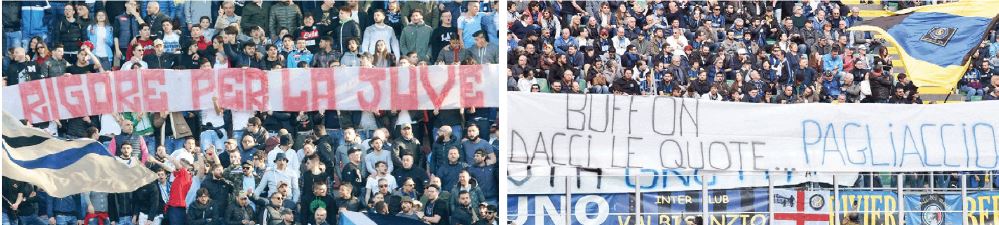 Di seguito due degli “striscioni” apparsi ieri sugli stadi italiani e che facevano riferimento alla questione “Juve”: