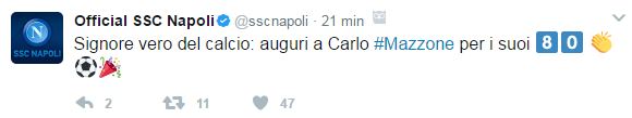 Difficile aver sentito qualcuno dire qualcosa di brutto su di lui. Appassionato e appassionante il suo modo di essere allenatore e vivere il calcio. Sanguigno, d’altri tempi. Vero. Auguri a Carlo Mazzone, da parte di chi ama questo sport e dalla SSCNapoli.