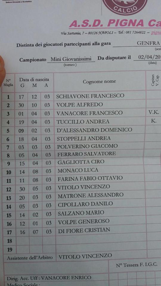 Vittoria per 2-0 per i nostri 2003 allenati da Mister Passariello che superano il Pigna Calcio nella 22ªGiornata del Campionato di Minigiovanissimi Regionali. Pratica iniziata e conclusa tutta nel primo tempo per i nostri azzurri, autori di una grande prestazione corale e bravi a mettere subito la gara al loro favore con le reti di Palumbo e Iacone, ragazzi in splendida forma e in stato di grazia da molte settimane. Ripresa da normale amministrazione per gli azzurri, un successo che permette alla nostra squadra di staccare il Pigna Calcio come nostra inseguitrice e continuare a puntare al quarto posto, un risultato finale di grande prestigio per coronare questa stagione di gran livello ormai ad un passo.