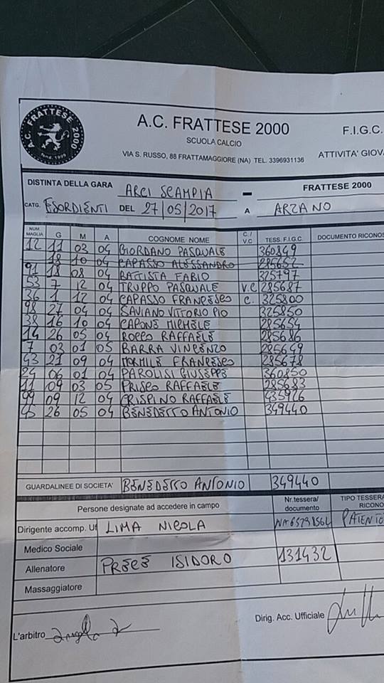 Poteva finire meglio alla fine siamo soddisfatti partita giocata al senso unico abbiamo sciupato troppo passano cinque minuti De Marco solo davanti al portiere mette il pallone a lato rimessa del portiere ospite il pallone finisce tra serio e il portiere faustico spunta Brarra che gli soffia il pallone e si fa commettere fallo da rigore calcia lo stesso barra e si porta in vantaggio vani tentativi ma finisce il primo tempo 1 a 0 x gli ospiti secondo tempo stessa musica ancora De Marco si mangia un goal fatto al 8vo del secondo tempo al 12mo punizione dal limite con barra il pallone si infila nell’angolo basso alla sinistra del portiere tentativi di Libraro da fuori area grande parata del portiere il terzo tempo dopo tanti tentativi ce la rete di De Marco la partita finisce 1 a 2 x la Frattese ce da fare i complimenti a tutti.