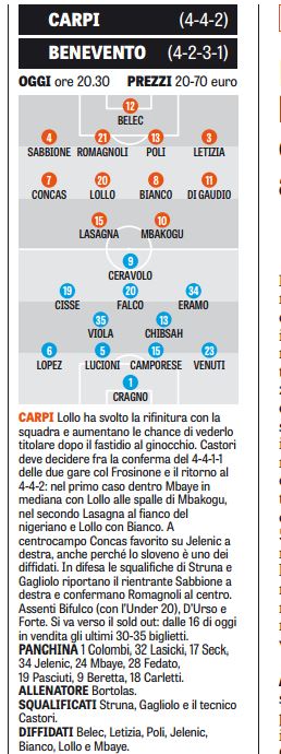 Ore 20:45 – Carpi/Benevnto le possibili formazioni