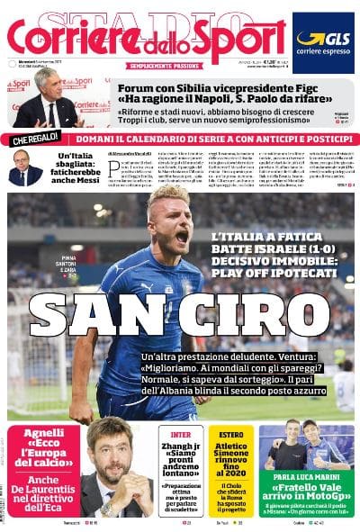 Di buono c’è che siamo a un punto dallo… spareggio mondiale, frutto di questo striminzito 1-0 a Israele, timbrato da Immobile e dal pari tra Macedonia e Albania. E mentre la Spagna seppellisce sotto altri 8 gol il Liechtestein (beata Roja) e vola verso la Russia, l’Italia ritorno al successo ma dimostra di avere in corpo ancora tutte le tossine accumulate al Bernabeu. Una vittoria che lascia aperti alcuni dubbi emersi a Madrid, a partire dal ruolo azzurro di Verratti, non solo sul piano tattico, uscito alla fine tra i fischi in capo a un prestazione estremamente deludente. Il 6 ottobre, quando a Torino arriveranno i macedoni per il match point azzurro, lui non ci sarà per squalifica. Ma più che pensare a come risolvere questa assenza, il ct dovrà riconquistare la piena fiducia nel suo progetto da parte di tutti, senatori e giovani. Dovrà trovare anche la giusta collocazione a Insigne, nuovamente sottotono, anche per sue responsabilità.