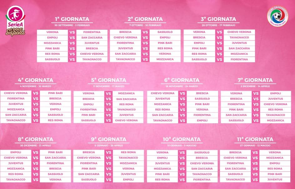 Dodici squadre a caccia del titolo, quattro nuovi club tra cui la Juventus per una stagione che si preannuncia entusiasmante e che avrà il suo prologo sabato 23 settembre con la sfida di Supercoppa tra Fiorentina e Brescia, le due squadre italiane che parteciperanno alla prossima UEFA Women’s Champions League. Alla prima di campionato la Juventus di Guarino andrà a far visita al Mozzanica, mentre spicca anche un Verona-Fiorentina. Ecco la foto del calendario della serie A femminile.