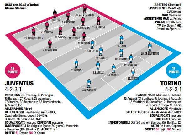 Turnover sì, ma ragionato, anche perché quando si gioca una volta ogni tre giorni qualcuno bisogna pur farlo rifiatare. Massimiliano Allegri parte da quelli che di sicuro non avrà: «Howedesèout (risentimento muscolare ai flessori della coscia sinistra, ndr), lunedì sapremo per quanto tempo ne avrà: diciamo che si è fatto male nel momento giusto, visto che tra una settimana ci sarà la nuova sosta per le nazionali e quindi avrà più tempo per recuperare. Marchisio farà i test la prossima settimana, Khedira mercoledì in Champions sarà a disposizione, per De Sciglio sono confermate le 4 settimane di stop, poi valuteremo se i tempi si potranno accorciare». L’infermeria è gremita ma la rosa ampia permette di tenereabada l’ansia: «Barzagli non gioca, è stato molto bravo con la Fiorentina, lo farò recuperare». Dentro Lichtsteiner e Alex Sandro sulle fasce, al centro della difesa ci sarà Chiellini, con Benatia favorito su Rugani. In mezzo Pjanic e Matuidi («Parla poco ed è intelligente»), davanti Costa può rilevare Mandzukic. Bernardeschi (che ieri ha risposto agli insulti via social per via dell’esultanza postFiorentina) probabilmente ancora in panca.