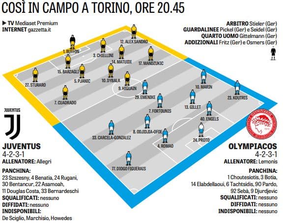 Ore 20:45 – Champions: Juventus/Olympiacos, le possibili formazioni