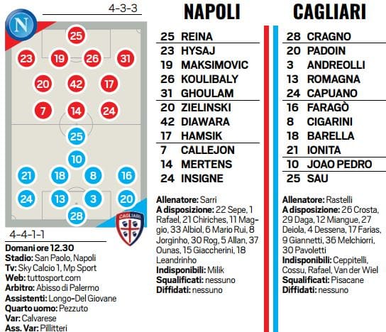 Oggi Sarri dovrebbe sciogliere l’ultimo dubbio, quello legato alla presenza di Albiol, ancora alle prese con un problema alla schiena. Se non dovesse farcela, dovrebbe essere confermato Maksimovic. nevralgica per tentare di introdurre qualche granellino di sabbia in un dispositivo magistralmente oliato. Ecco dunque la pazza idea di Rastelli di inserire dal via Faragò sul versante destro del centrocampo, con Cigarini a far coppia con Barella al centro e Ionita a sinistra. In difesa, assodato che Pisacane (squalificato) e Ceppitelli (infortunato) sono “out”, esordio di Romagna a comporre la “strana coppia” con Andreolli al centro, mentre Padoin (a destra) e Capuano (a sinistra) agiranno sulle fasce. In avanti Joao Pedro assisterà Sau, unica punta solitaria, deputata a rendere vita difficile ai difensori azzurri. Nella seduta mattutina del venerdì, Pavoletti e Farias si sono uniti al gruppo, ma la precarietà della condizione suggerisce si una convocazione per la trasferta, ma un utilizzo mirato. Non certo una situazione idilliaca. Una “goleada” sfavorevole potrebbe indurre la società a seria riflessione. Nel frattempo, Rastelli si coccola Barella e Romagna, entrambi convocati nell’Under 21 di Gigi Di Biagio ma anche Miangue, chiamato nella stessa Nazionale di categoria del Belgio. Resta l’ “oggetto misterioso” Van der Wiel, sempre in “personalizzato”: va bene che è arrivato a Cagliari praticamente gratis ma tenerlo ai margini per infortunio oramai da un mese è davvero fastidioso.