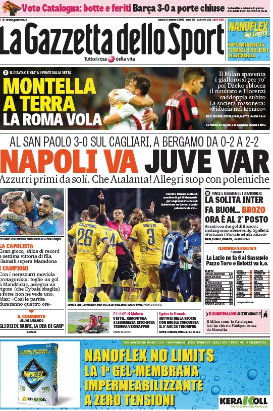 Il Napoli va, la Juve Var. Così titola in prima pagina la Gazzetta dello Sport. Gli azzurri primi in classifica collezionano una sfilza di record. A breve la cronaca dettagliata.