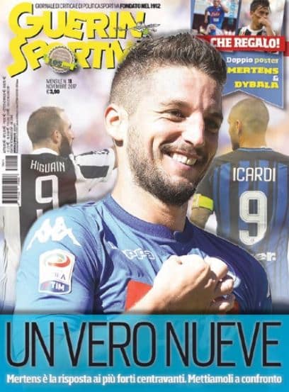 Arriva domani in edicola un altro imperdibile numero del Guerin Sportivo che, oltre a fornirvi i soliti approfondimenti sul mondo del pallone e non solo, vi regala anche un doppio poster con due dei maggiori protagonisti di questo inizio di campionato: Mertens e Dybala. E proprio il folletto belga è l’uomo copertina di questo numero. Ormai è un vero centravanti come voleva Sarri e lui sta ripagando la fiducia del tecnico alla media di quasi un gol a gara. Non manca un punto sul campionato che si è fermato per lasciar spazio alle Nazionali, ma già sabato si torna in campo con due grandi sfide: Juventus-Lazio e Roma-Napoli.