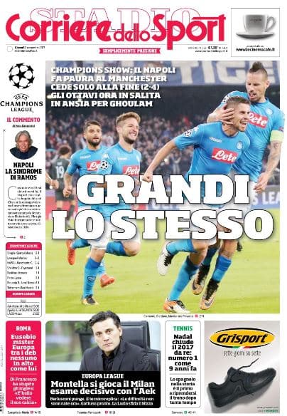 Il Napoli è stato se stesso, anzi, il meglio di se stesso, per 20 minuti, fino allo splendido gol di Insigne. Poi il City ha ripreso quota, ma nel secondo tempo ancora Napoli, col carattere di una squadra forte. E’ stata in assoluto una partita stupenda. Può sembrare una consolazione, ma da ieri il Napoli sa di poter giocare quasi alla pari della migliore squadra d’Europa di questo momento, strutturata per vincere la Champions e ovviamente già qualificata a punteggio pieno. Fonte: CdS