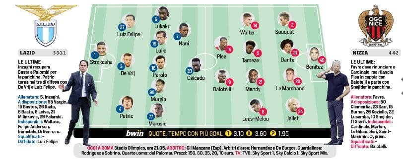 NewsCalcio [Ore 21,05] Europa League – Lazio-Nizza le possibili formazioni By Giuseppe Sacco il Nov 2, 2017 - 19:00:01 0 Condividi Queste le probabili formazioni del Corriere dello sport della gara di Europa League Factory della Comunicazione anti-NizzaEuropaLazioLeague 0 Condividi FacebookTwitterGoogle+ReddItWhatsAppPinterestE-mail