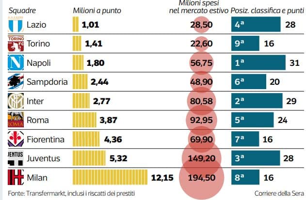 La sintesi è che la storia del «chi più spende meno spende» funziona per l’idraulico, la credenza o le scarpe da tennis: perché il calcio, signori, è un’altra cosa. A 80 giorni dall’inizio del campionato e a due mesi dalla chiusura della sessione di mercato più dissoluta della storia del nostro calcio, 835 milioni di euro, una montagna di quattrini che ci ha proiettato al secondo posto in Europa dietro all’inarrivabile Premier (1,5 miliardi), la classifica della serie A conferma una vecchia e ormai consolidata convinzione: i soldi contano, aiutano, fanno la felicità dei tifosi sotto l’ombrellone, però non bastano. Anzi a volte possono paradossalmente diventare un ostacolo: meglio averli, chiaro, ma non occorre essere pratici di psicanalisi per capire quanto il peso psicologico di un investimento non comune possa schiacciare perfino il più scafato dei giocatori. Ogni riferimento al Milan e Bonucci, giusto per buttar lì un nome, è del tutto voluto. I rossoneri sono stati il primo club per investimenti estivi, 194,50 milioni, e se a quasi un terzo del campionato si trovano all’8° posto significa che stanno tecnicamente sotto di sei posizioni. Certo, in Europa c’è chi fa peggio come l’Everton, 158 milioni e terz’ultimo posto, ma non è granché come consolazione. André Silva, pagato 38 milioni, è costato fin qui 44.106 euro al minuto. Non benissimo. Un cortocircuito, quello rossonero, che si può spiegare anche attraverso un calcolo facile facile ma illuminante: ogni punto è «costato» la bellezza di 12 e passa milioni di euro, una follia, dodici volte tanto la Lazio primatista del parametro spesa-resa. Un punto, un milione. Lotito ne ha messi sul tavolo 28,50 per accaparrarsi fra gli altri Marusic, Nani, Lucas Leiva, e oggi si trova quarto. Si chiama fiuto per gli affari e nel caso specifico il merito è tutto del d.s. Igli Tare, l’alchimista del mercato che ha messo in mano a Simone Inzaghi una squadra eccellente che sta reggendo anche agli urti e alle scomodità dell’Europa di seconda classe. Investimenti pochi ma mirati, un modello di business sportivo esemplare. Il rapporto fra bilancio di mercato estivo e posizione premia anche il Toro, più indietro in classifica ma con una media di 1,41 milioni sborsati per punto ottenuto e soprattutto con il 7° saldo di tutta Europa, il rapporto cioè fra acquisti e cessioni, +54,20 milioni. Lazio, Torino, quindi Napoli (1,80 milioni a punto) che però dall’alto del suo primo posto nella classifica reale è oggettivamente per ora il vincitore del premio spesaresa. Ma lì la condizione specifica è Sarri e il suo piano di scolarizzazione triennale di un gruppo che rispetto a un anno fa è rimasto nella sostanza identico: l’obiettivo è lo scudetto, vedremo. Non male nemmeno l’Inter, 2,55 milioni per punto: gli acquisti stanno tutti rendendo (Skriniar, Vecino, Borja Valero) però è vero anche che in estate Suning non ha investito poco, circa 80 milioni, 4° dato della serie A. Di certo meno dalla Juve che con i suoi quasi 150 ha un rendimento costosetto, oltre 5 milioni per ognuno dei 28 punti che non le stanno garantendo, come invece era nelle intenzioni, il primo posto. A 26 partite dalla fine c’è però ancora molta vita da vivere, parecchio può succedere, può andare meglio o peggio, a tutti. Anzi no, al Benevento no: 20 milioni, zero punti, acqua da tutte le parti. Difficile però basti un buon idraulico.