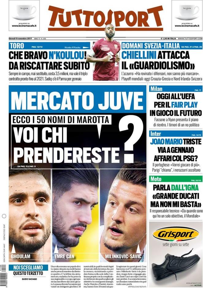 Oggi in prima pagina spiccano tre nomi che Tuttosport estrapola dai 50 nomi di Marotta spicca Ghoulam con Can e Savic