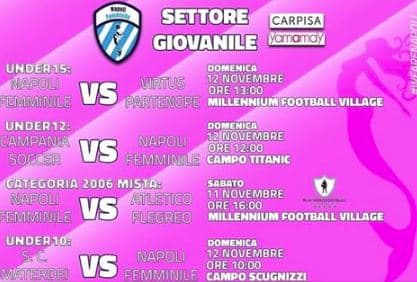 4 squadre femminili giovanili in campo in questo inizio di campionati ufficiali . Senza contare due squadre in C ( primavera e Soccer woman ) regionale e la prima squadra . E’ così che si espande il calcio femminile permettendo a tante ragazze di tutte le età di giocare e coronare il loro sogno di giovani , tutto ciò in un paese che di sogni ai giovani ne offre davvero pochi. Le facciamo allenare tre volte la settimana nella struttura sportiva più bella e funzionale di Napoli . Basta . Peccato per quelle e per coloro che non l’hanno ancora capito”.