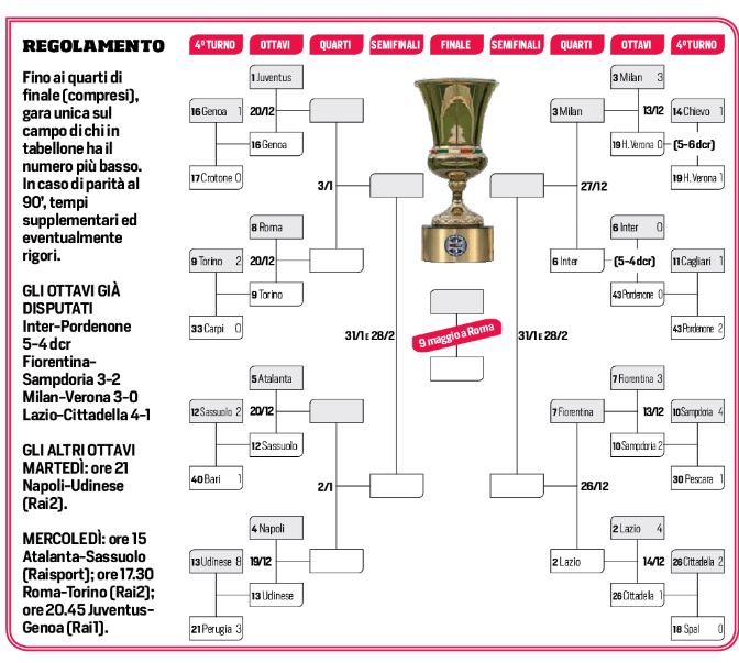 Dopo che Inter, a fatica con il Pordenone, il Milan e la Lazio, il tabellone di Coppa Italia dalla parte destra si è completata, ora si attende la zona di sinistra. Inizierà il Napoli di Sarri che sfiderà martedì alle ore 21,00 l’Udinese. Mercoledì invece si giocheranno le partite: Atalanta-Sassuolo, Roma-Torino e Juventus-Genoa.