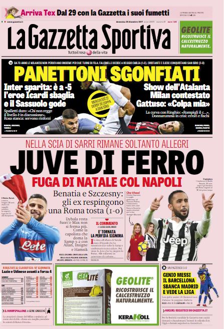 NewsCalcioRassegna Stampa La Gazzetta – Fuga di Natale con Napoli e Juve By Giuseppe Sacco il Dic 24, 2017 - 07:40:36 0 Condividi Napoli e Juve fanno prove di allungo e allontanano i “panettoni sgonfiati”. Nella scia di Sarri resta solo Allegri Factory della Comunicazione AllegriJuveNapoliNatale 0 Condividi FacebookTwitterGoogle+ReddItWhatsAppPinterestE-mail