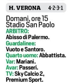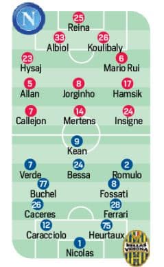 Domani allo stadio San Paolo, con fischio d’inizio alle ore 15,00 la capolista Napoli sfiderà l’Hellas Verona nel più classico dei testa-coda. Maurizio Sarri, dopo il turnover di Coppa Italia contro l’Atalanta, manderà in campo i titolarissimi Reina, Albiol, Allan, Jorginho e Insigne. Unico dubbio è sula fascia sinistra Maggio o Mario Rui, con il secondo in leggero vantaggio. In casa scaligera Pecchia potrebbe rinunciare a Bruno Zuculini infortunato, al suo posto Fossati. Per il resto l’ex Napoli schiererà il classico 4-2-3-1 con Verde, Bessa e Romulo alle spalle del classe 2000 Kean.