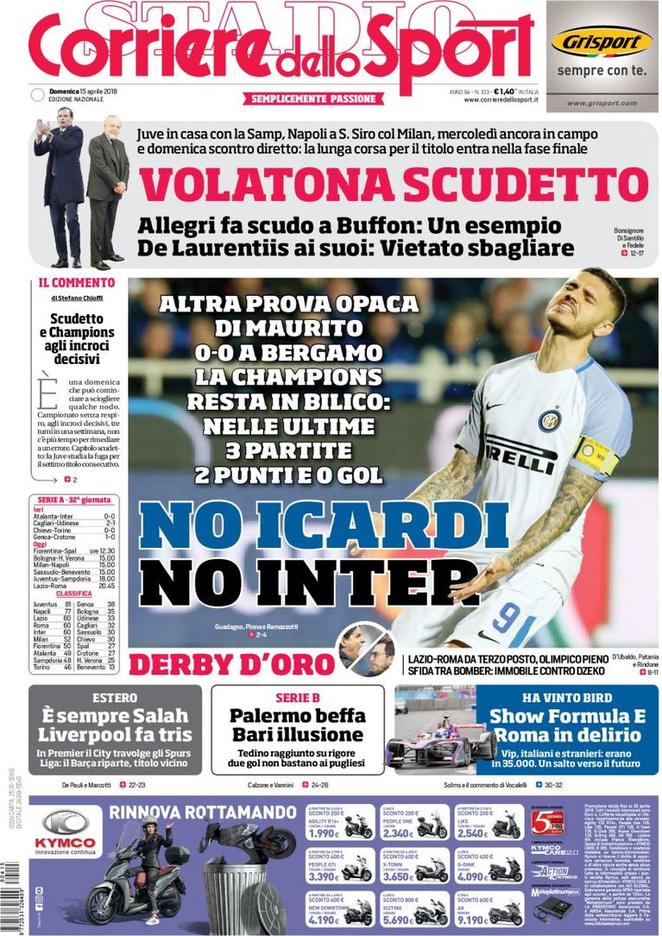 NewsCalcioIn Evidenza Rassegna stampa – L’edicola sportiva del 15 aprile By Giuseppe Sacco il Apr 15, 2018 - 08:00:07 0 Condividi Oggi in primo piano sui principali quotidiani sportivi Factory della Comunicazione 0 Condividi FacebookTwitterGoogle+ReddItWhatsAppPinterestE-mail