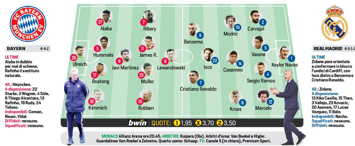 NewsCalcioCampionati Europei Champions: Bayern-Real – Il CdS dà le due formazioni “monstre” By Giuseppe Sacco il Apr 25, 2018 - 17:30:52 0 Condividi Secondo il CdS Real e Bayern scenderanno in campo così Factory della Comunicazione 0 Condividi FacebookTwitterGoogle+ReddItWhatsAppPinterestE-mail
