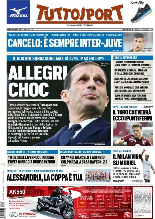 Tuttosport – Allegri choc: i tifosi non lo vogliono più