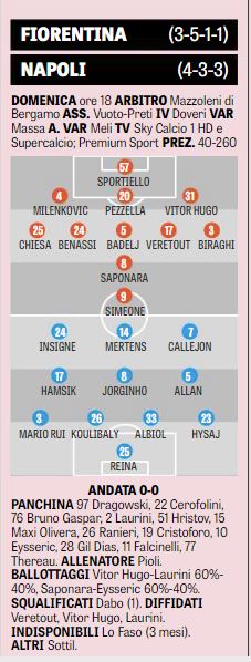 Fiorentina-Napoli: la Gazzetta dà le sue formazioni