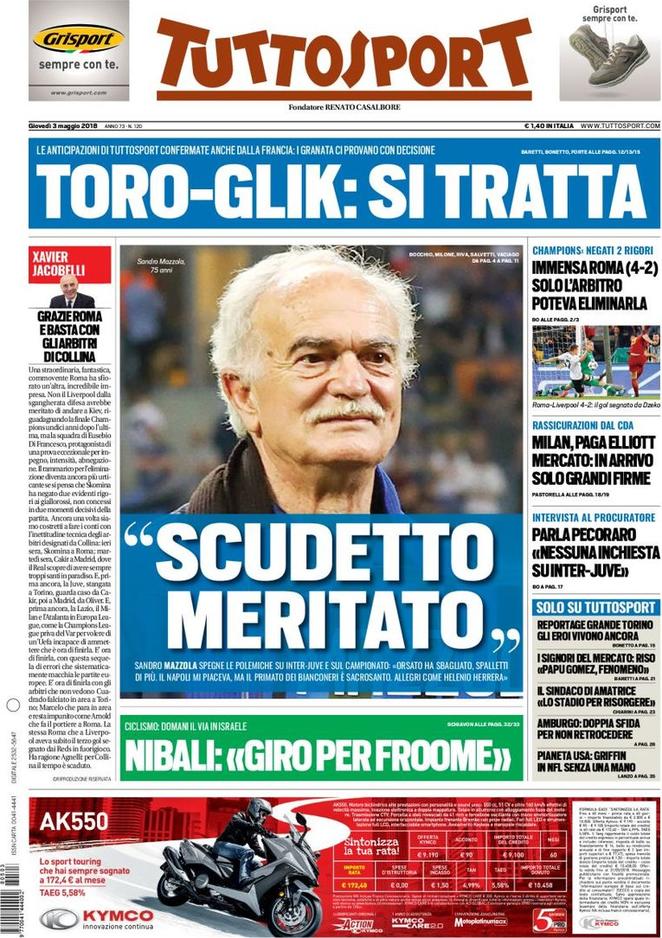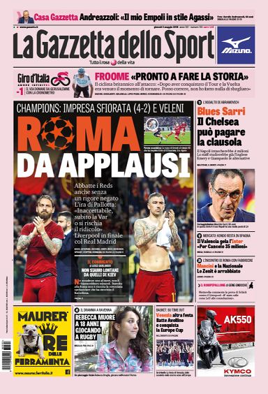 NewsCalcioIn Evidenza Rassegna stampa – L’edicola prime pagine sportive nazionali del 3 maggio By Giuseppe Sacco il Mag 3, 2018 - 08:15:50 0 Condividi Oggi in primo piano sui quotidiani nazionali Factory della Comunicazione 0 Condividi FacebookTwitterGoogle+ReddItWhatsAppPinterestE-mail