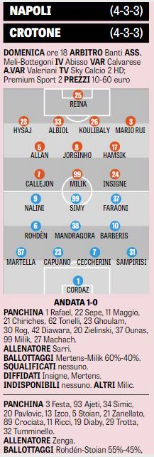 In difesa confermati i due centrali ma bisognerà capire se a destra ci sarà ancora Sampirisi come contro la Lazio oppure toccherà a Faraoni provare ad annullare le giocate di Insigne. In attacco Nalini e Simy appaiono intoccabili, Trotta si gioca un posto da titolare con Ricci e tra i compiti che dovrà svolgere anche quello di fermare in prima battuta il fluidificante Mario Rui.