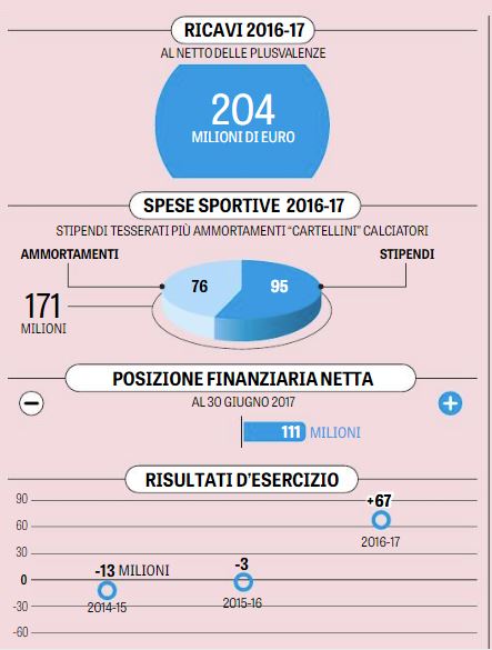 Juve prima, Inter seconda, poi Napoli, Roma e l’incognita Milan. Se volessimo stilare una griglia di partenza delle grandi del campionato, in termini di potenza di fuoco economico-finanziaria da far valere sulla campagna trasferimenti, la situazione sarebbe questa. Avvertenza: il mercato è fatto di budget ma nasconde mille pieghe, dettate dalle opportunità che si creano (o si chiudono), da una buona dose di intuito e temerarietà di certi suoi protagonisti, da operazioni rischiose per le finanze e da alchimie contabili. Ecco perché la fotografia dei bilanci è un’utile indicazione degli orientamenti dei manager in quello che è il principale core business di una squadra di calcio, la compravendita dei giocatori, però non porta necessariamente a conclusioni nette. Ne è un esempio il mercato della scorsa stagione del Milan, con quel saldo negativo da quasi 200 milioni prodotto da un azzardo: scommettere sul salto di qualità dei rossoneri per agganciare i proventi Champions. Sappiamo com’è andata. Fonte: gasport