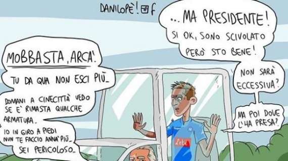 Bene, vero? Benissimo. E dunque è meglio scherzarci su: proprio come ha fatto Danilo Pergamo, un disegnatore napoletano che ha realizzato una vignetta con l’attaccante polacco blindato in un’auto modello Papa-mobile guidata da De Laurentiis. «Basta Arca’, da qua non esci più: sei pericoloso!», la frase emblematica di un preoccupato presidente. Memore, ovviamente, dei due infortuni rimediati dall’attaccante polacco nella prima e nella seconda stagione azzurra: i crociati di entrambe le ginocchia.