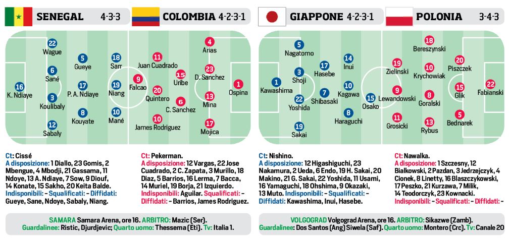 Queste le possibili formazioni di Panama-Tunisia, Giappone-Polonia e Senegal – Colombia. tutte in campo nel pomeriggio