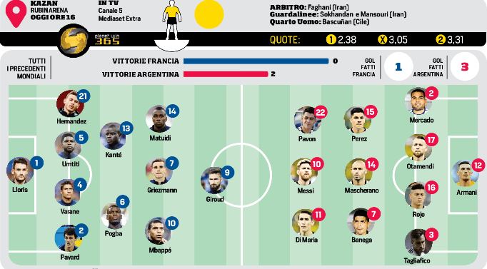 Se il c.t. dell’Argentina sia Sampaoli o il gruppo probabilmente resterà un mistero, ma non c’è dubbio che il favorito di sua maestà Messi sia Cristian Pavon. Oggi potrebbe essere il giorno in cui i due giocheranno assieme dal 1’, nuova soluzione tattica contro la Francia che prevede Leo centravanti «falso», come precisano gli argentini, e due esterni veloci e pronti ad accentrarsi. Da un lato Di Maria, dall’altro il giovane Pavon, ventidue anni e già stella del Boca (il che dovrebbe renderlo gradito anche a Maradona). Sembra in bilico Higuain che, dopo la Croazia, aveva preso il posto di Aguero. Anche lo juventino non ha convinto del tutto, si è mangiato con la Nigeria un’occasione enorme, è sembrato lento. «Non ho ancora deciso e non ho comunicato la formazione ai giocatori», dice Jorge Sampaoli. Ma la suggestione Pavon, fin qui mai titolare, c’è. Dalla Russia alla Russia. Secondo il Cds ecco le formazioni: