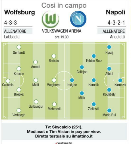 Questa sera alle ore 19,30, presso la “Wolksfagen Arena”, si gioca l’ultima amichevole estiva del Napoli di Ancelotti, avversario i padroni di casa del Wolfsburg. Gli azzurri scenderanno in campo con il modulo ad “albero di Natale” e il debutto di Zielinski dal primo minuto. A gara in corso possibile impiego di Mertens. Per i tedeschi allenati da Bruno Labbadia, invece sarà 4-3-3, in attacco lo svizzero Mehmedi e a centrocampo l’esperto Guilavogui.