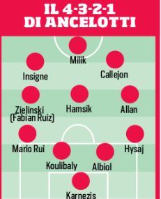 ATTACCO. Che sia albero di Natale, che sia tridente, sembra quasi tutto scritto, anche perché Mertens è tornato da una decina di giorni e dunque non ha ancora gamba a sufficienza per sfidare i suoi compagni di reparto. E allora: a destra ci sta Callejon, magari largo o anche un po’ più stretto; e il suo omologo, sull’altro fronte, sarà Insigne. La punta, ma non si scappa da questa scelta, diventa Arkadiusz Milik, due sole partite da titolare nelle ultime sei gare della passata stagione.