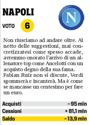 Oggi il CdS propone un bilancio di mercatro di tutte le squadre di serie A. Secondo il Corriere dello Sport Ancelotti andava onorato con un acquisto eccellente.